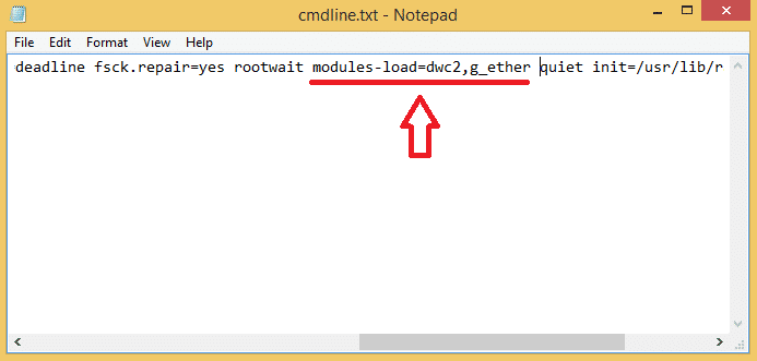 Sau đó các bạn dùng Notepad để mở tập tin cmdline.txt. Sau đó các bạn thêm dòng modules-load=dwc2,g_ether vào sau rootwait.