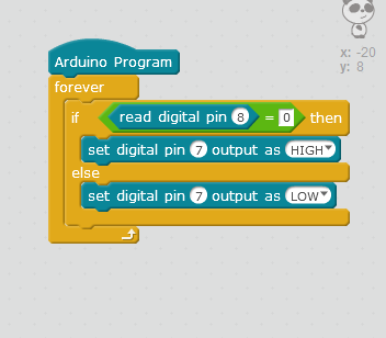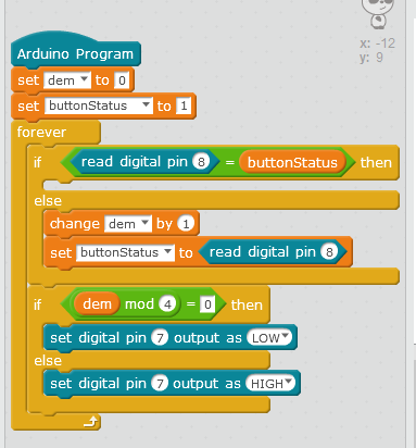 Nhớ chọn chế độ Arduino Mode nha. Sau đó lập trình theo sơ đồ sau (Không hiểu thì xem lại phần 3,4 nha)