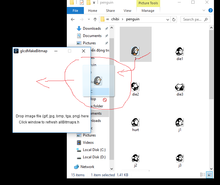- Nhấn giữ rồi kéo thả ảnh xuống cái cửa sổ chương trình glcdMakeBitmap.jad trên