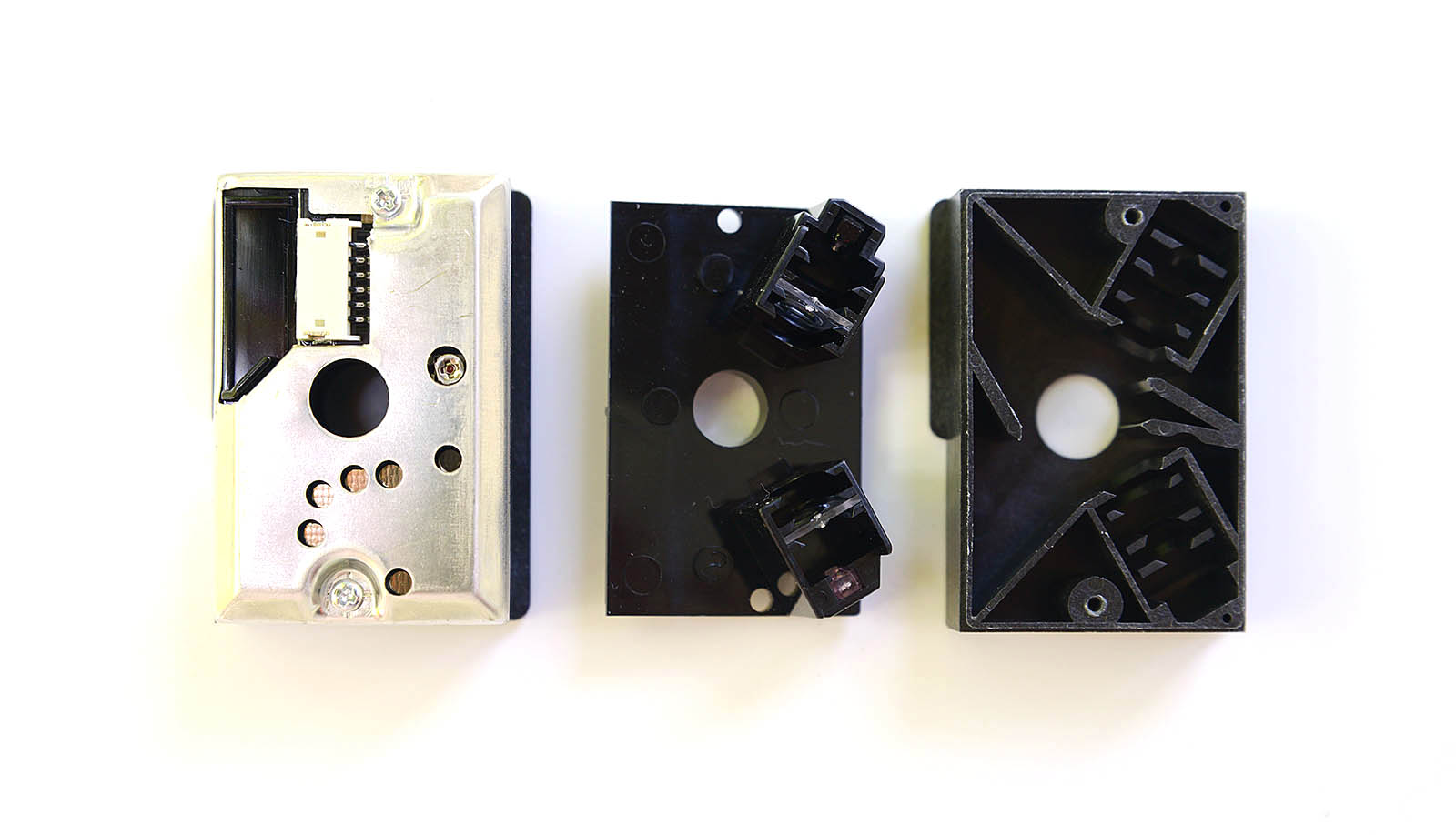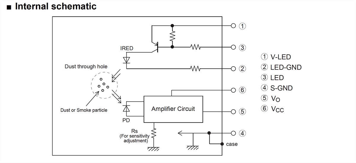 Ở đây ta thấy sẽ có 02 bộ phận dùng để truyền và nhận hồng ngoại (IR LED và Phototransistor). 02 bộ phận này được đặt chệch gốc với nhau. Khi có bụi bay vào, tia hồng ngoại từ IR LED sẽ bị dội vào Phototransistor, lúc này điện áp từ phototransistor sẽ được đưa đến mạch khuếch đại (Amplifier) và xuất ra chân Vo.