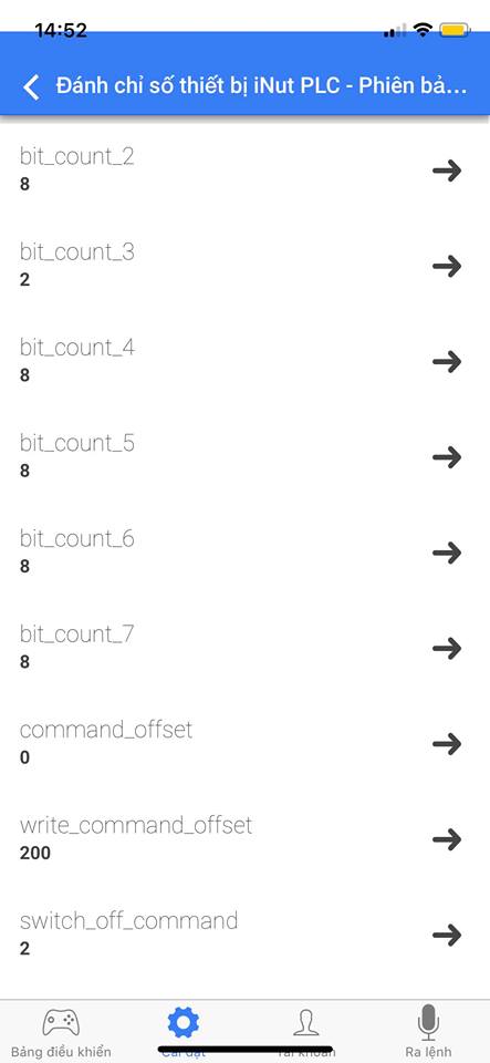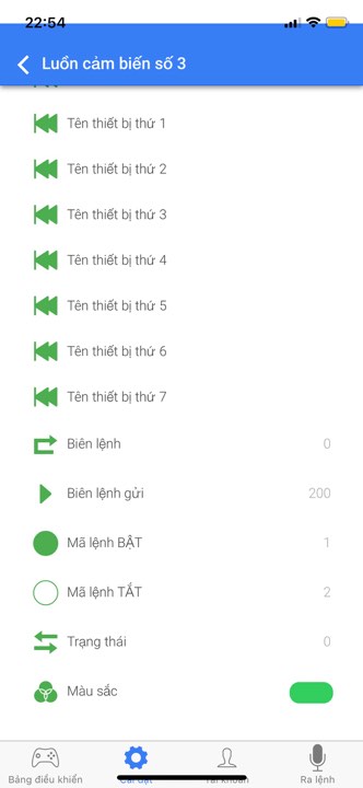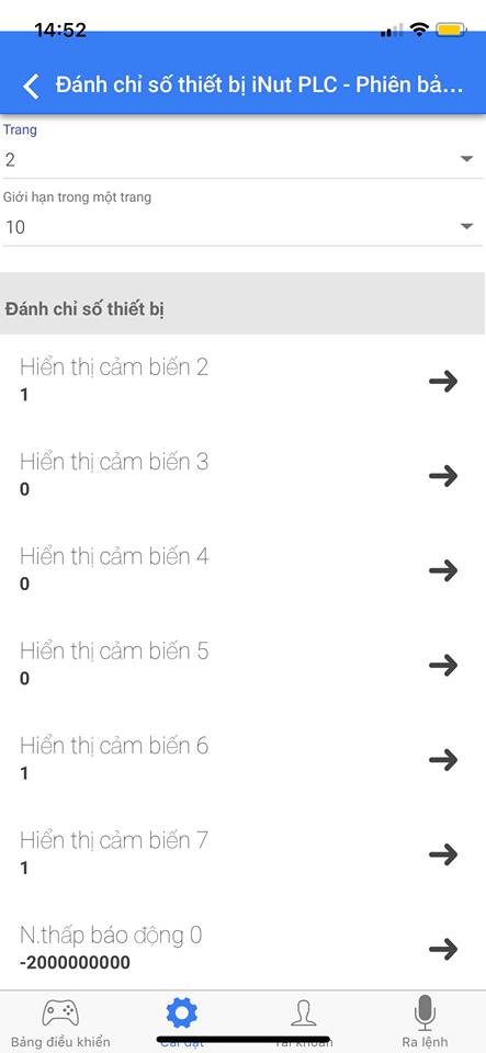 Ở đây chúng ta có thể thấy các dòng Hiển thị cảm biến từ 0 - 7. Các dòng Hiển thị cảm biến có số 1 thì nó đang được hiển thị trên app còn số 0 thì bị ẩn trên app (Bị ẩn nhưng nó vẫn nhận dữ liệu từ PLC gửi về). Cụ thể: