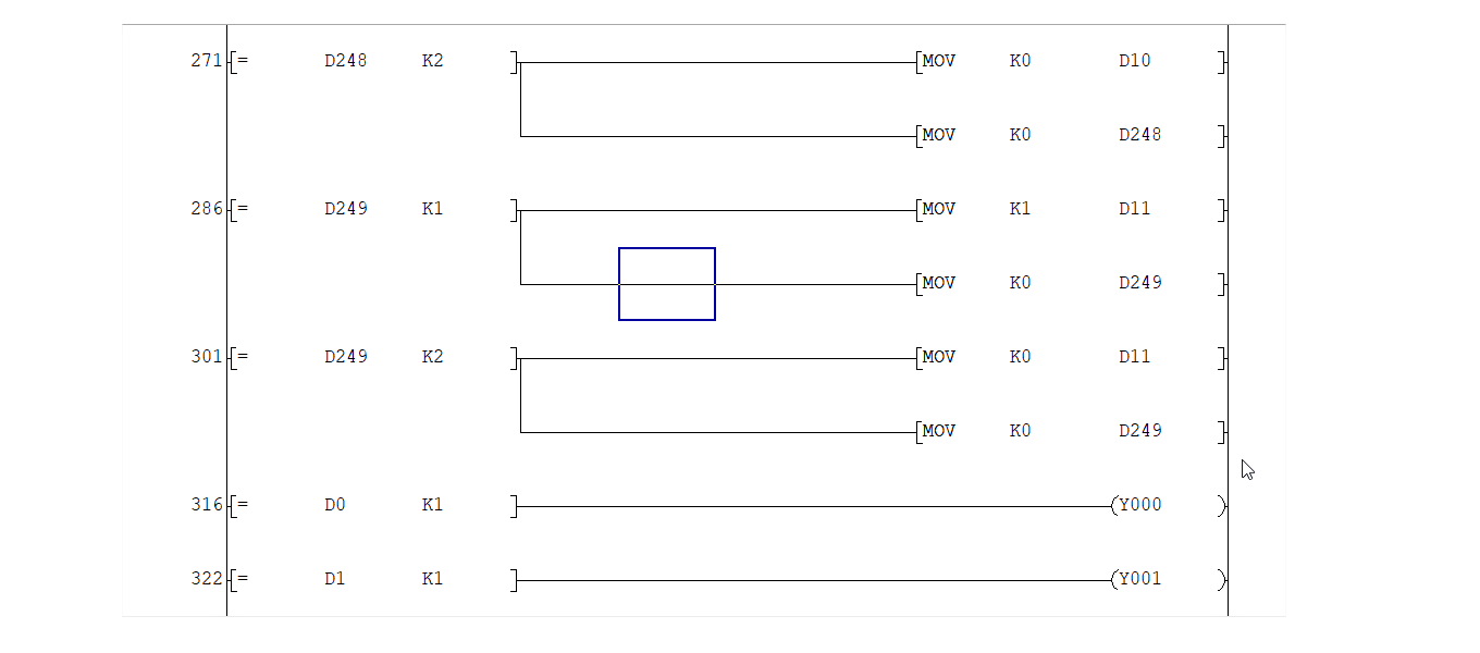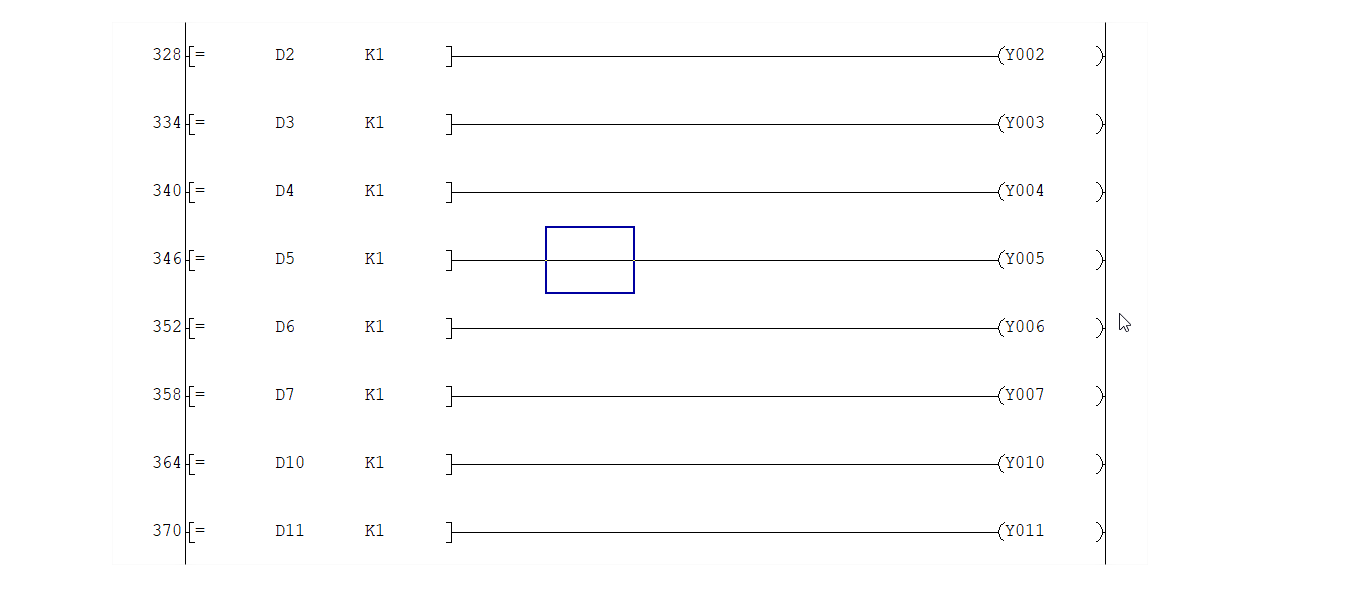 - Dòng 316 - 370: Bật tắt các ngõ ra từ Y00 - Y011 của PLC