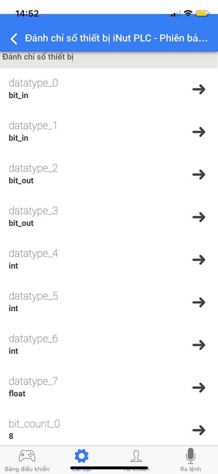 - 3 dòng đầu để giao tiếp với iNut PLC, ở đây iNut PLC sẽ cung cấp cho ta 8 luồng dữ liệu thông qua 8 thanh ghi D101 - D108