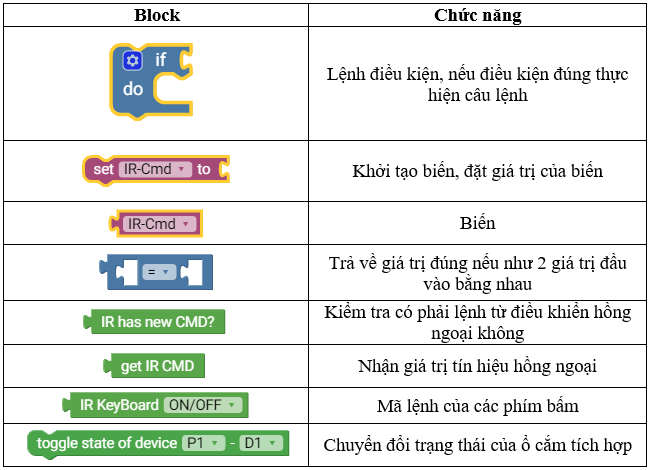 Tập các block để đọc dữ liệu từ điều khiển hồng ngoại và các tập lệnh để điều khiển ổ cắm tích hợp đều có sẵn: