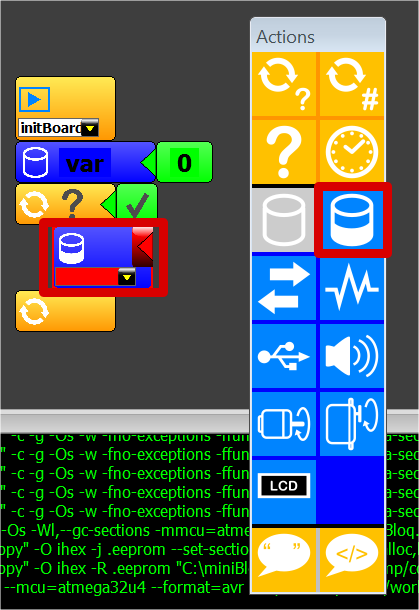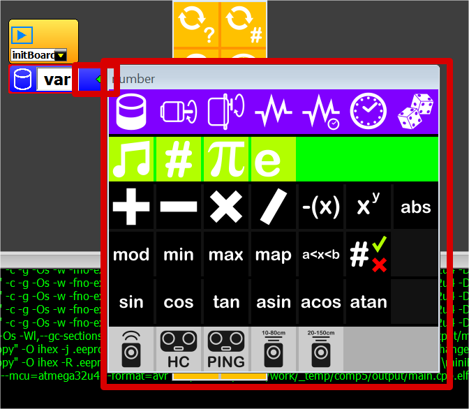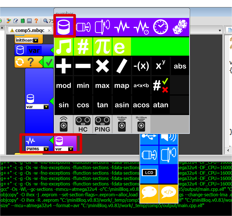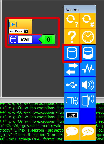 Đầu tiên ta sẽ tạo một biến tên là var để lưu giá trị analog từ biến trở rồi từ đó biến đổi để băm xung cho led. Thực hiện bằng cách chọn hình cái lcon bên trái.