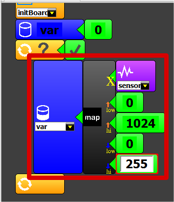 Ta có một biến a đọc giá trị từ 0-1023. Ta muốn biến đổi nó có giá trị từ 0-255 thì thực hiện như sau: b=map(a,0,1023,0,255);
